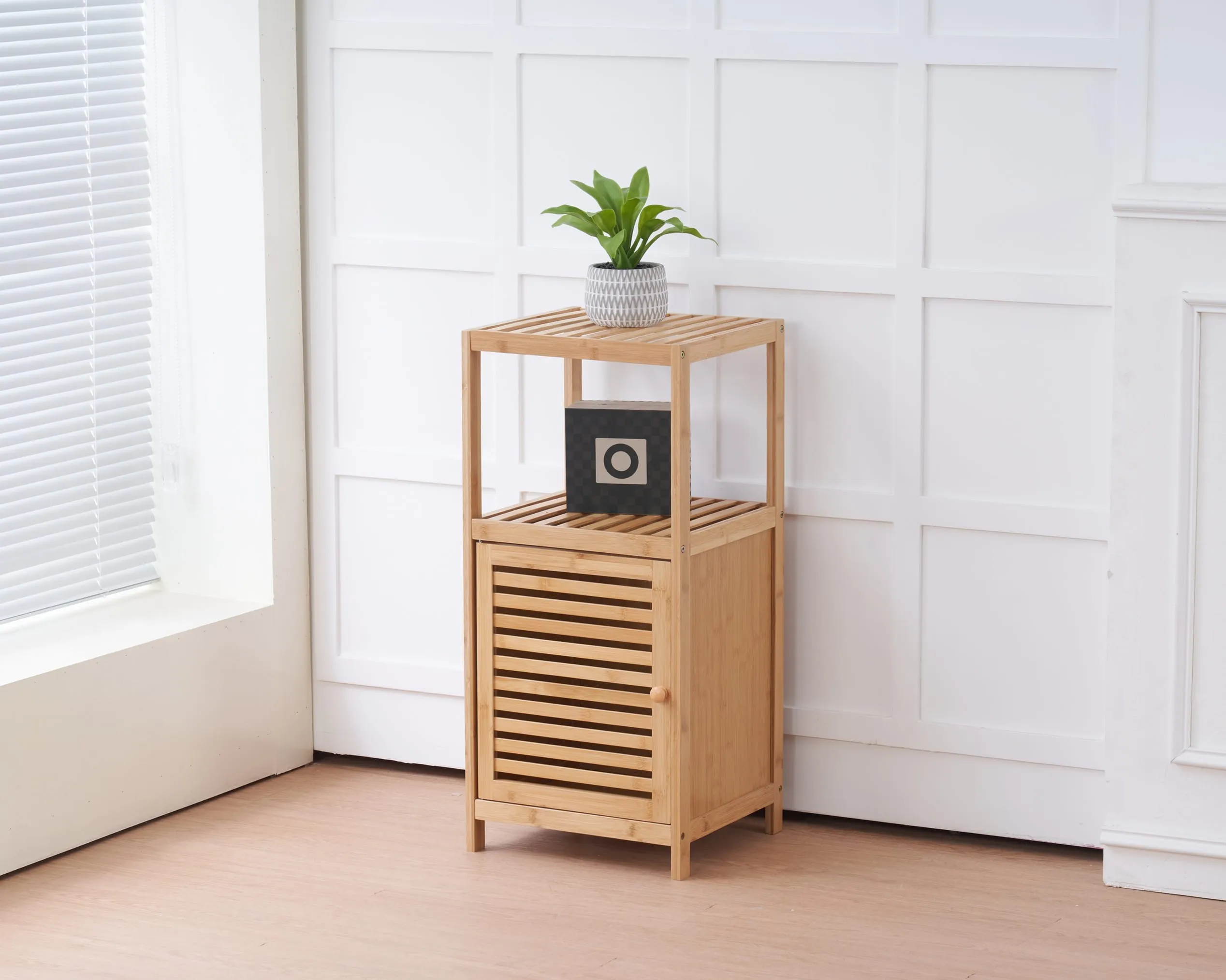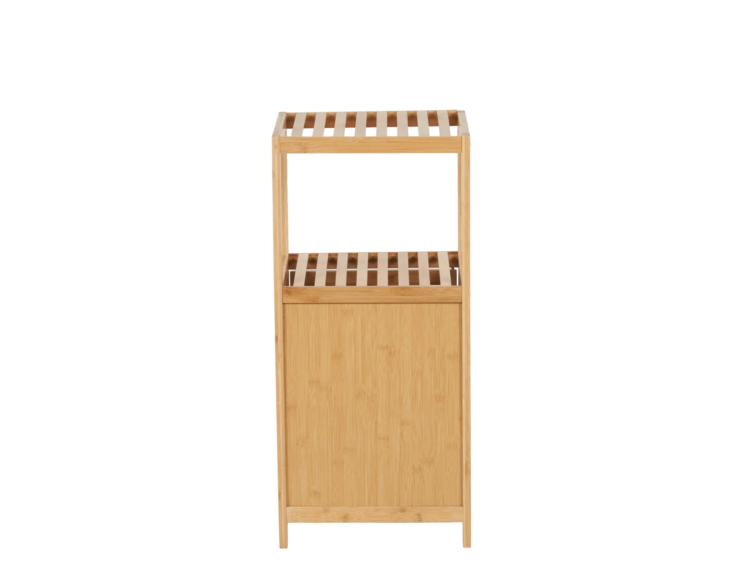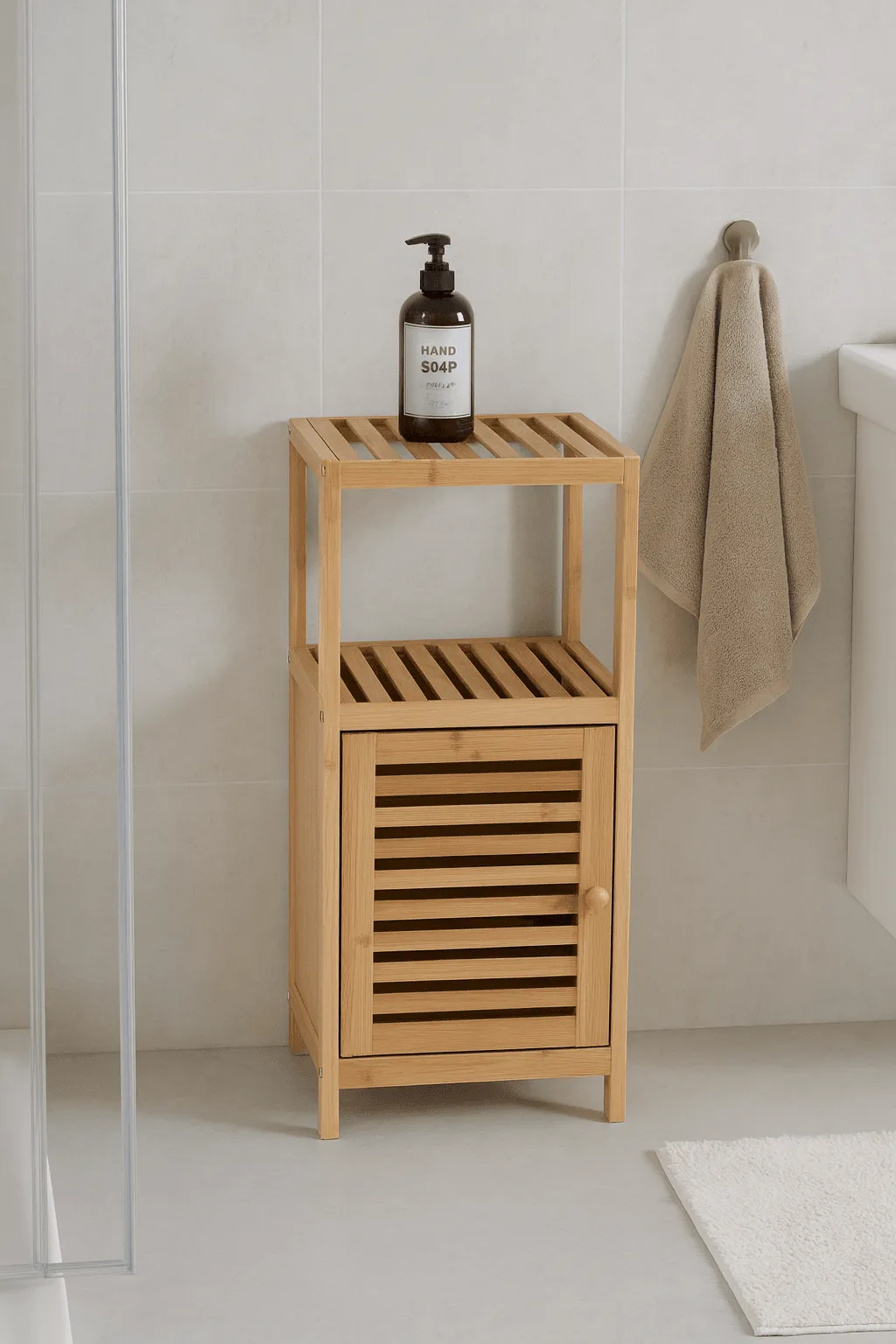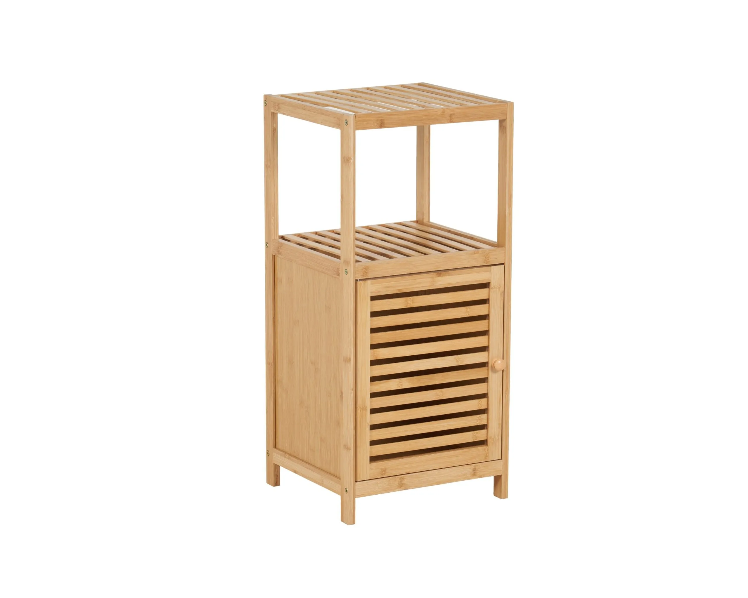 יחידת מדפים מעץ במבוק טבעי עם 2 מדפים פתוחים וארון אחסון סגור. עמידה בלחות, מתאימה לחדר אמבטיה, סלון ומטבח. עיצוב חמים ואלגנטי.