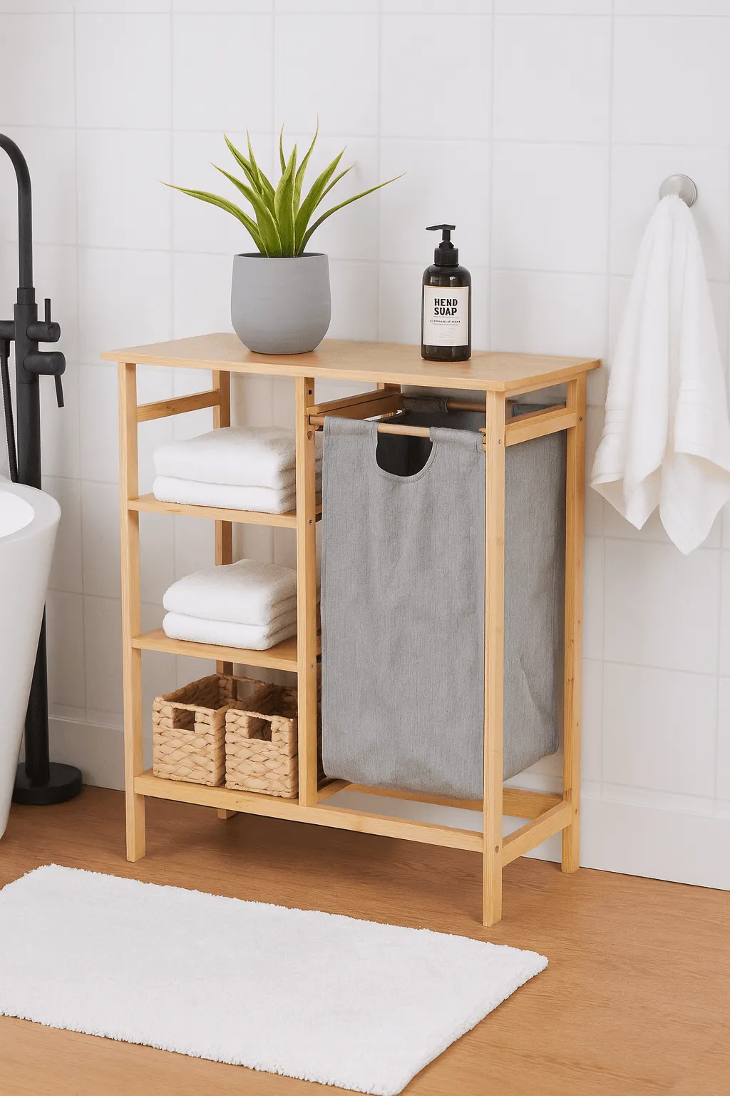 כוננית רב־תכליתית בעיצוב מודרני ונקי, המשלבת 4 מדפים פתוחים לאחסון נגיש ומסודר יחד עם סל כביסה מרווח המיועד לשמירה על בגדים לפני כביסה. עשויה מעץ במבוק טבעי, הכוננית מציעה מראה חמים ואסתטי לצד עמידות גבוהה במיוחד בפני לחות – מושלם לשימוש בחדרי רחצה.
