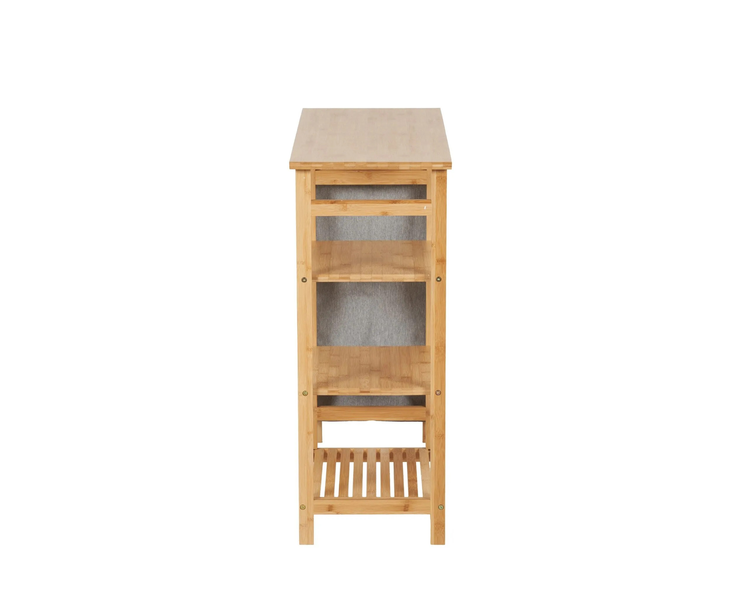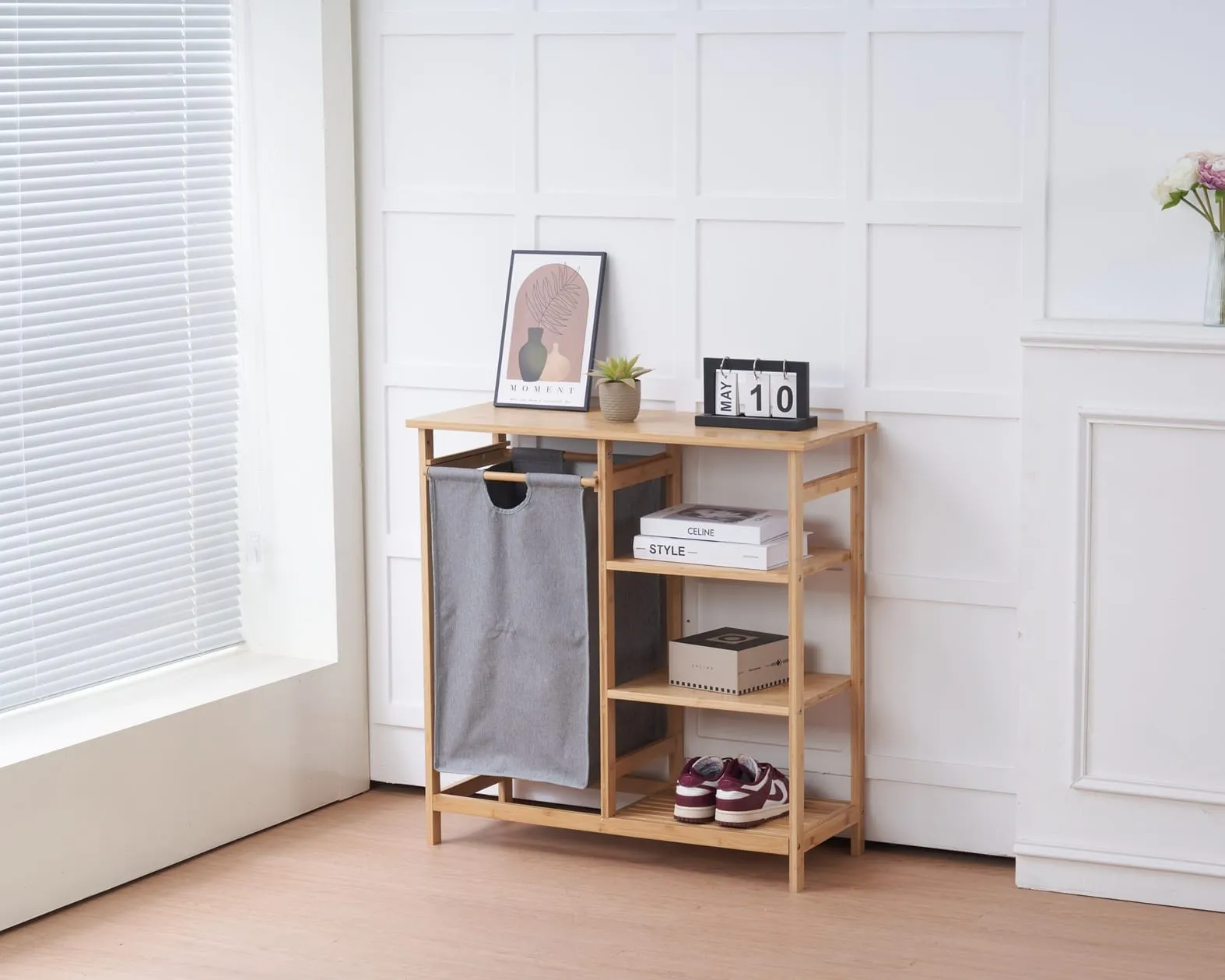 כוננית במבוק רב־תכליתית עם 4 מדפים פתוחים וסל כביסה מובנה. עיצוב אלגנטי, עמידות גבוהה ללחות, מתאים במיוחד לחדרי רחצה ולשמירה על סדר ואסתטיקה.