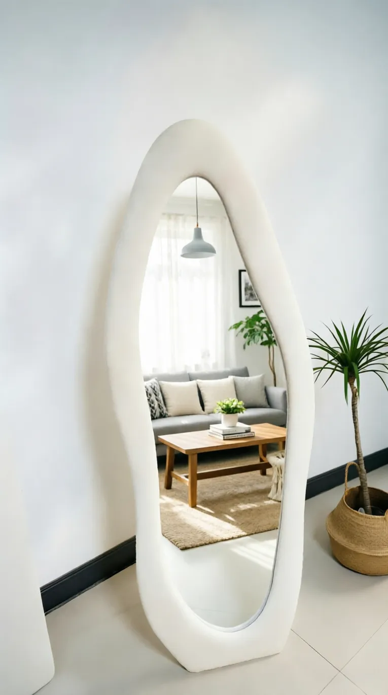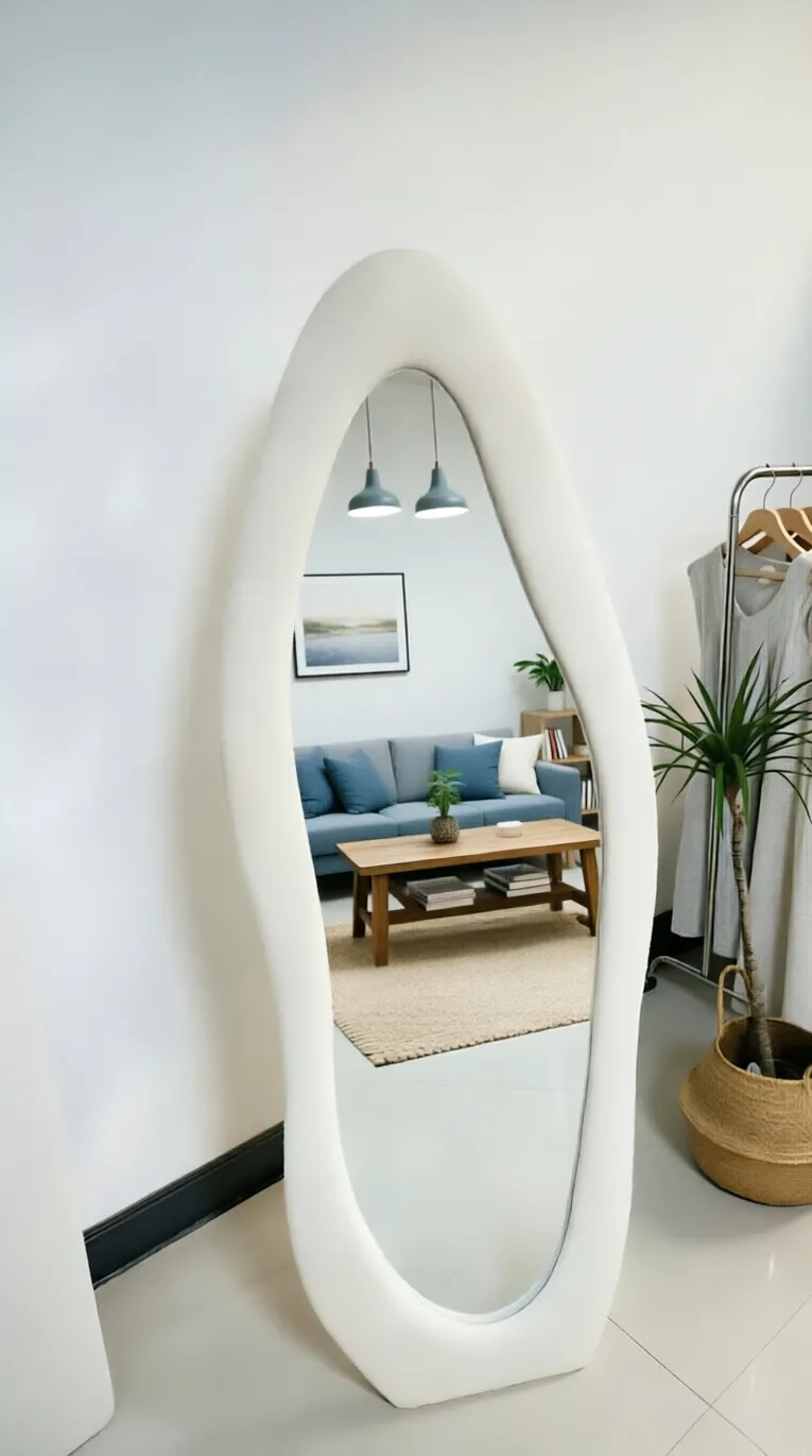 מראת גוף אמורפית בעיצוב יוקרתי מבית Step Up, מרופדת בבד קטיפה רך ונעים בצבע קרם.