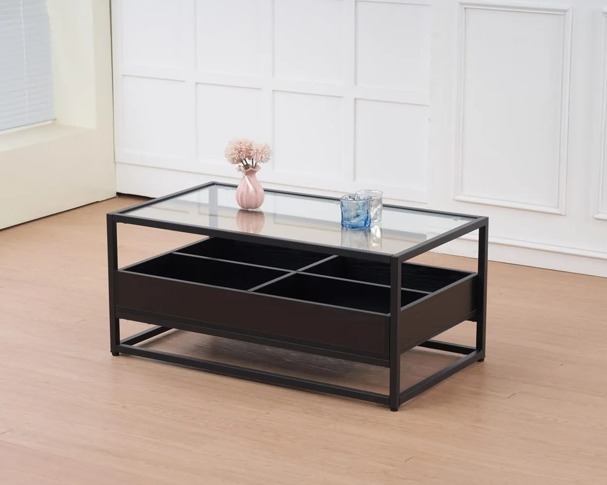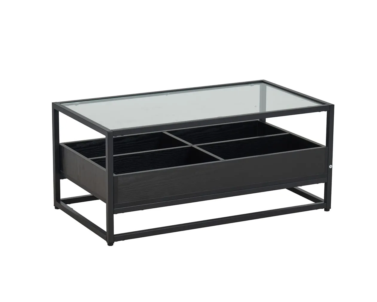 השולחן כולל ארבעה תאי אחסון תחתונים, כך שתוכלו לשמור על סלון מסודר ונגיש. לדוגמה, תוכלו לאחסן ספרים, שלטים, מגזינים או פריטים דקורטיביים. כתוצאה מכך, המשטח העליון נשאר פנוי ומוכן לאירוח או לשימוש יומיומי.